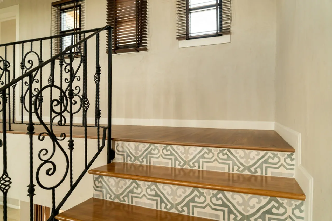 Главная роль в дизайне отведена гармоничному союзу материалов. Теплый, золотистый оттенок ступеней из бука создает ощущение уюта, в то время как перила из кованого металла добавляют композиции строгости и изысканности. Изящные декоративные узлы на балясинах подчеркивают тонкую ручную работу, а деликатный орнамент на подступенках вносит в дизайн нотку эксклюзивности и завершенности.